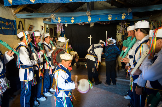 La fiesta dura 2 días, la Cofradía de Chinos cantan en coplas improvisadas, comandados por el “Alferez”, título casi nobiliario, que refleja la fuerte autoridad que éste ejerce en el momento del rito, acompañándolo de vez en cuando con su interminable y constante sonido de flautas de madera, adornando de música todo el lugar. El tambor marca el ritmo y secunda al alférez a la hora de danzar y rendir las plegarias.